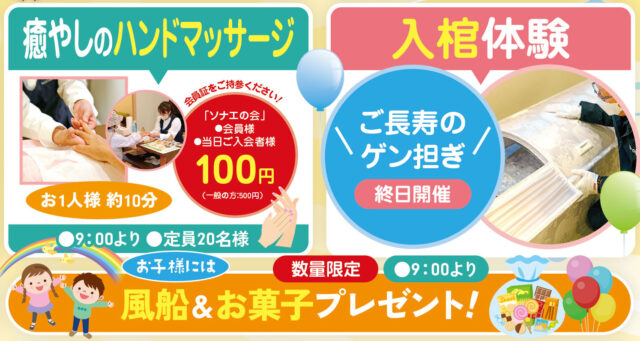 さらに、プロのカメラマンとヘアメイクによる「生前遺影写真撮影会」や、癒やしのハンドマッサージ体験、ご長寿のゲン担ぎとして人気の入棺体験など、日常では体験できない企画も多数ご用意しています。