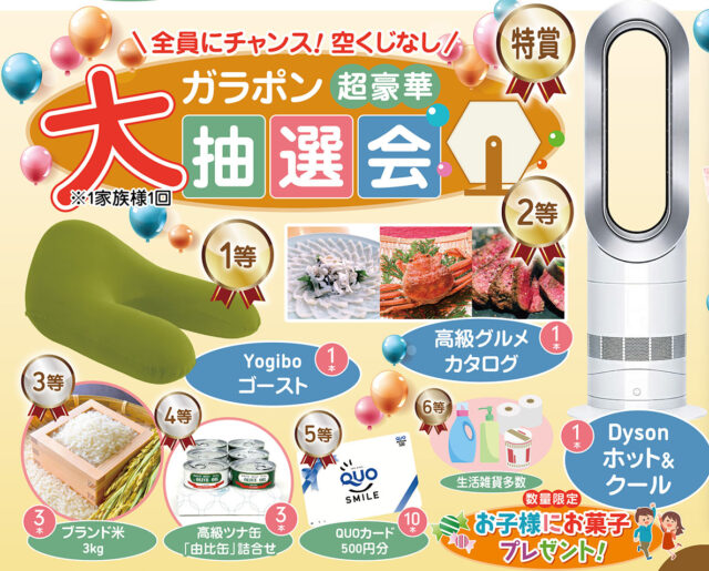 当日は、空くじなしで楽しめる「ガラポン大抽選会」を開催します。Dyson ホット&クールをはじめ、Yogibo ゴーストや高級グルメカタログ、ブランド米など、さまざまな景品をご用意しています。抽選はアンケートにご協力いただいた方が参加でき、1家族様1回チャレンジしていただけます。