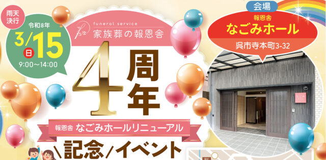 家族葬の報恩舎では、地域の皆さまへの日頃の感謝の気持ちを込めて、「なごみホール リニューアル4周年記念イベント」を開催いたします。