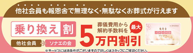 他社会員から「ソナエの会」へご入会いただいた場合、葬儀費用から解約手数料を最大5万円まで割引いたします。詳しくは会場スタッフまでお気軽にお声がけください。
