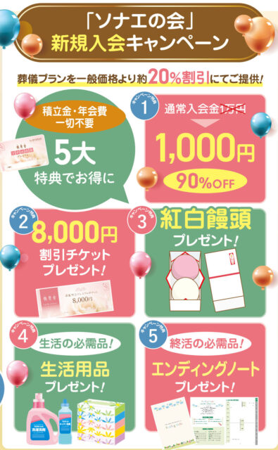 「ソナエの会」は積立金や年会費が不要で、葬儀プランを一般価格より約20%割引でご利用いただける会員制度です。今回のイベントでは、通常1万円の入会金が1,000円になるほか、葬儀割引チケットや紅白饅頭、生活用品、エンディングノートなど、5つの特典をご用意しています。