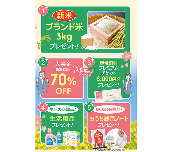 まず目玉特典として、新米のブランド米3kgをプレゼント。そのほか、葬儀割引プレミアムチケット8,000円分や、日々の暮らしに役立つ生活用品、さらにご希望の方には「おうち終活ノート」もお渡しいたします(数量限定)。