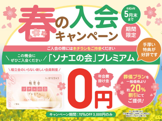 「ソナエの会」プレミアムは、積立金のいらない新しい会員制度です。年会費・掛け金は0円、キャンペーン期間中は入会金も通常1万円のところ、70%OFFの3,000円のみでご入会いただけます。