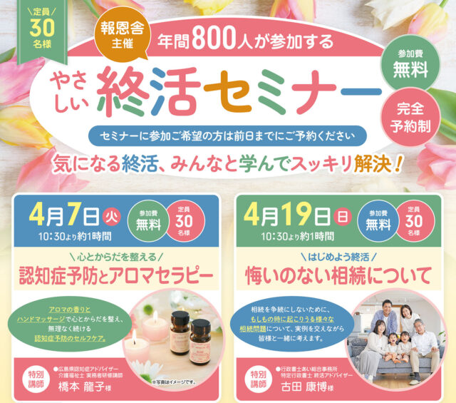 報恩舎では、年間800人が参加する「やさしい終活セミナー」を4月も開催いたします。