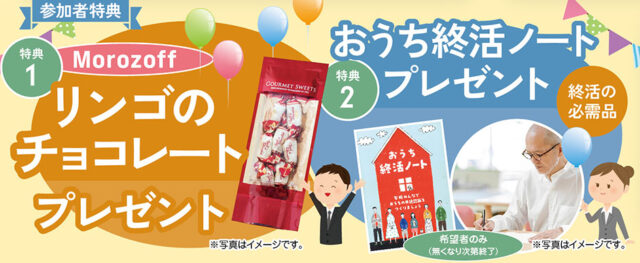 ご参加いただいた皆様には、Morozoff「リンゴのチョコレート」と「おうち終活ノート」(ご希望の方)をご用意しております。ちょっとした楽しみとともに、終活を身近に感じていただけるひとときとなれば幸いです。