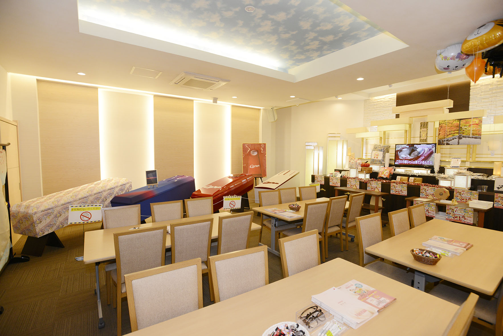 ホール内の展示コーナーでは、カープコラボ棺&骨壺に加えて、季節感のある仏衣を展示。